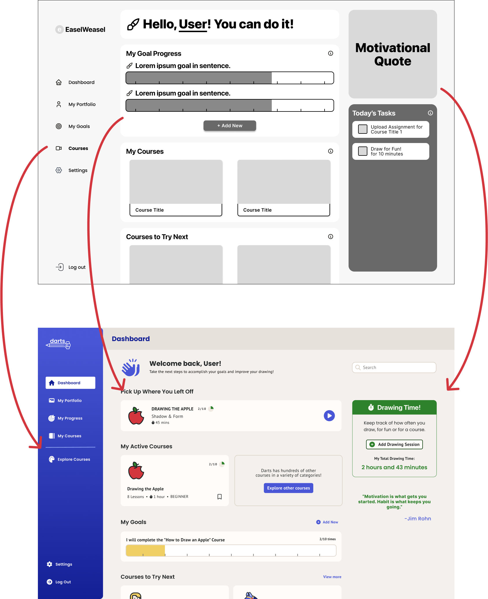 When reflecting on this project, I think Darts fills a much-needed niche as not just a drawing platform, but a motivational, educational platform. As more and more users move from traditional in-person lessons to remote learning, they will expect an up-to-date and easy to use product that satisfies both the need for good quality lessons as well as a smooth and encouraging platform.